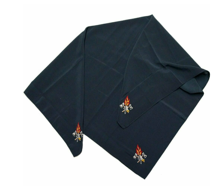Gewebtes Emblem mit Helm, gekreuzten Äxten und Flammen in jeder Ecke