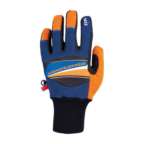 - Rückhand: Aus blau- und orangefarbenem Nylon mit angenehm weicher Acrylfütterung, reflektierenden Fingereinsätzen und Sublimationsdruck „JUGENDFEUERWEHR“ auf Neopren.